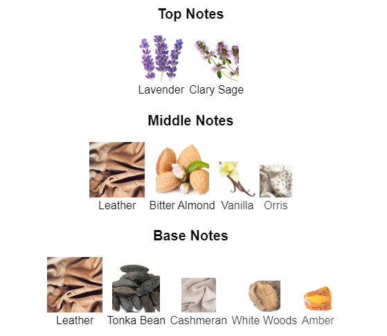 Key ingredients of the composition include bitter almond oil, tonka bean, orris root, leather, cashmerean and clary sage oil.
