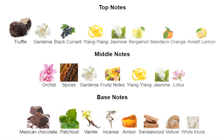 Black Orchid by Tom Ford is a Amber Floral fragrance for women. Black Orchid was launched in 2006. Black Orchid was created by David Apel and Pierre Negrin. Top notes are Truffle, Gardenia, Black Currant, Ylang-Ylang, Jasmine, Bergamot, Mandarin Orange and Amalfi Lemon; middle notes are Orchid, Spices, Gardenia, Fruity Notes, Ylang-Ylang, Jasmine and Lotus; base notes are Mexican chocolate, Patchouli, Vanille, Incense, Amber, Sandalwood, Vetiver and White Musk.Black Orchid was created by perfumers of the fragrance company Givaudan in 2006. It was announced as an oriental chypre. The top notes are French jasmine, black truffle, ylang-ylang, black currant, and effervescent citrus. In the floral-spicy heart, dwells Tom Ford's black orchid, more imaginary than real, and the base combines woodsy notes (patchouli and sandalwood), dark chocolate, incense, amber, vetiver, vanilla, and balsam.