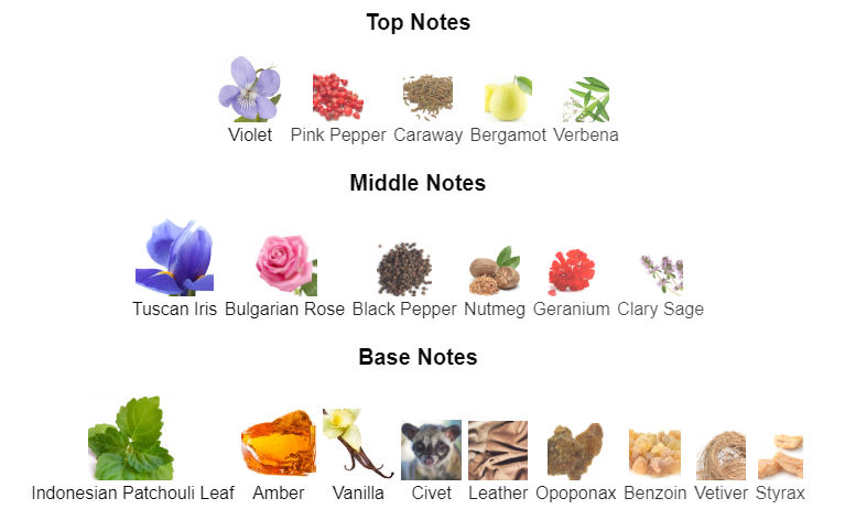 Noir by Tom Ford is a Amber Woody fragrance for men. Noir was launched in 2012. The nose behind this fragrance is Olivier Gillotin. Top notes are Violet, Pink Pepper, Caraway, Bergamot and Verbena; middle notes are Tuscan Iris, Bulgarian Rose, Black Pepper, Nutmeg, Geranium and Clary Sage; base notes are Indonesian Patchouli Leaf, Amber, Vanilla, Civet, Leather, Opoponax, Benzoin, Vetiver and Styrax.